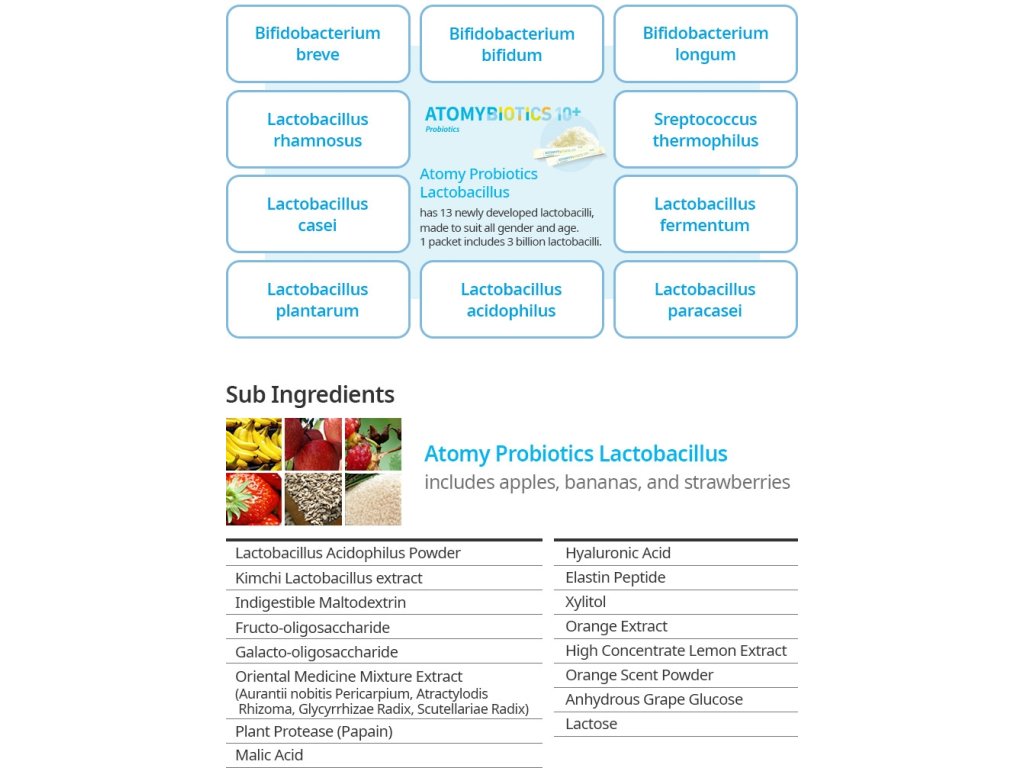 Atomy Probiotika - každá tyčinka obsahuje 3 miliardy prospěšných bakterií z 10 různých kmenů. Kompozice také zahrnuje oligosacharidy, které jsou potravou pro prospěšnou střevní mikroflóru a přispívá k jejímu množení.
